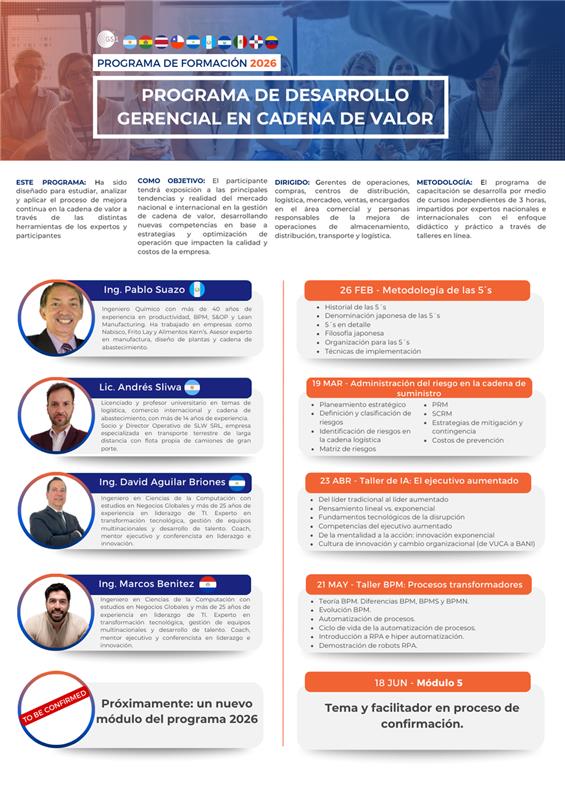 Para el 2026, ponemos a su disposición un programa de cursos 100% digital, los cuales pueden tomarse de forma individual o integrarse en un Diplomado al completar los 11 módulos. Cada sesión es impartida por expertos nacionales e internacionales, brindando a los participantes una visión actualizada sobre tendencias, retos y oportunidades de la región centroamericana en la gestión de operaciones, eficiencia, costos y optimización estratégica.