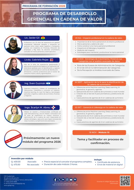 Si desea conocer más sobre los temarios completos, coordinar un curso personalizado o explorar temas adicionales para su equipo, puede comunicarse con nuestro Departamento de Servicio al Asociado escribiendo a servicio.asociado@gs1gt.org o llamando al (502) 2245-9595. Será un gusto brindarle más información y acompañarle en este proceso de formación.
