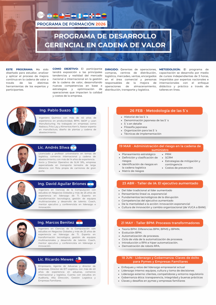 Para el 2026, ponemos a su disposición un programa de cursos 100% digital, los cuales pueden tomarse de forma individual o integrarse en un Diplomado al completar los 10 módulos. Cada sesión es impartida por expertos nacionales e internacionales, brindando a los participantes una visión actualizada sobre tendencias, retos y oportunidades de la región centroamericana en la gestión de operaciones, eficiencia, costos y optimización estratégica.