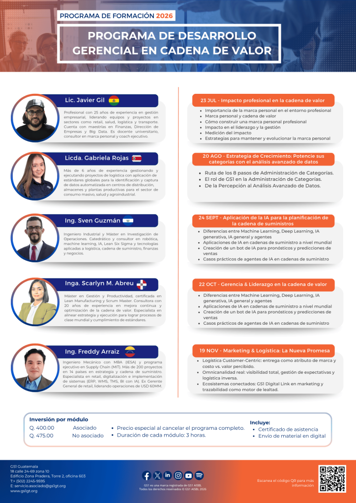 GS1 Guatemala cuenta con más de 20 años de experiencia impartiendo programas de formación especializados en la cadena de valor, fortaleciendo las capacidades de profesionales y empresas a través de las mejores prácticas utilizadas en el mercado local e internacional.
